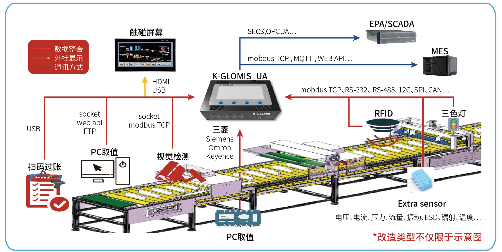 1. 透过K-GLOMIS UA加装扫码枪、RFID、视觉检测达到自动过账功能2. 透过K-GLOMIS UA对接机台的PC、PLC或者是机台上的传感器进行数据采集,实时监控制程参数